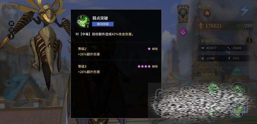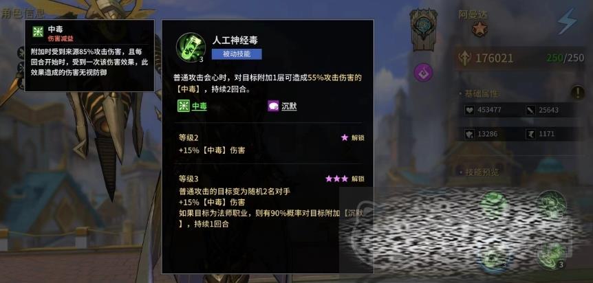 这样的效果能够迅速削弱敌方多个单位的生命值,并为后续的中毒效果铺垫,沉默效果的附加,更是让敌人在战斗中失去反击的能力,而被动技能会大幅提升了她的攻击力、速度和会心率,这是最基础的提升增益技能,大部分角色的第一个被动都是这样的效果,第二个被动会让阿曼达把自己的武器进行特殊的强化。