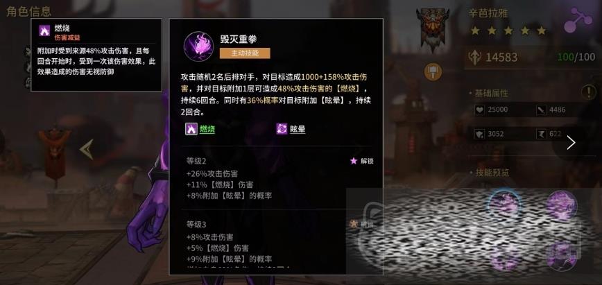 作为一个战士职业,其实辛芭拉雅是比较适合作为队伍的主要输出使用的,她的主动技能焚天之泉可以凝聚火焰之力,这个重拳不仅对随机两名后排对手造成巨额伤害,还附加了持续6回合的燃烧效果,使他们在火海中不停的掉血,同时有一定概率令这两名敌人再眩晕2个回合,让他们在烈焰之中无法动弹。