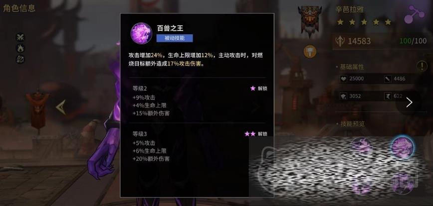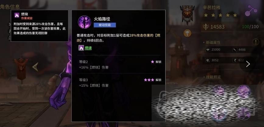 第一个被动可以让辛芭拉雅的攻击和生命得到了大幅提升,同时也提升她对燃烧的目标能够造成的伤害数值更高,这个被动加上上面的技能就可以带来很高输出了,第二个被动是每次普通攻击都有可能触发的,只要触发就能够对敌人附加持续6回合的燃烧效果,这种效果能够让敌人慢慢丧失战斗力。
