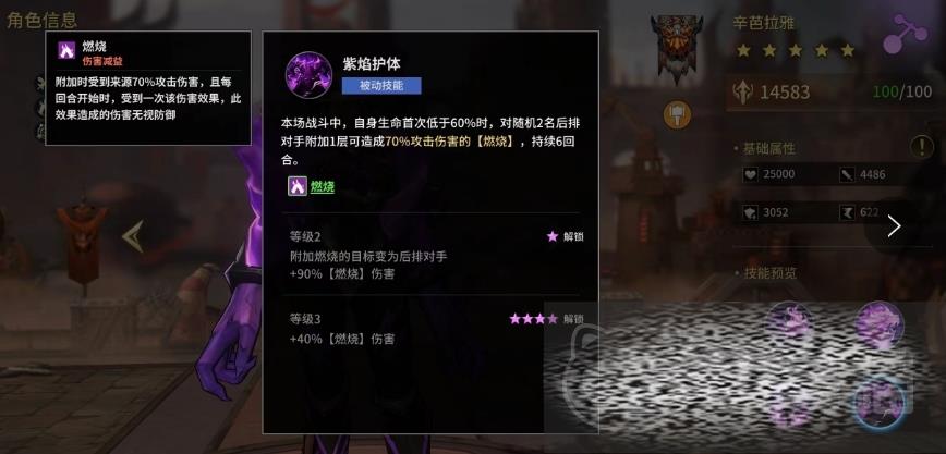 这种紫焰能够对后排对手附加燃烧效果,造成大量持续伤害的同时为她提供一定的保护,这个燃烧效果同样也是可以持续六个回合不停带来伤害的,这个被动的效果大家就可以看成是辛芭拉雅的反击手段了。