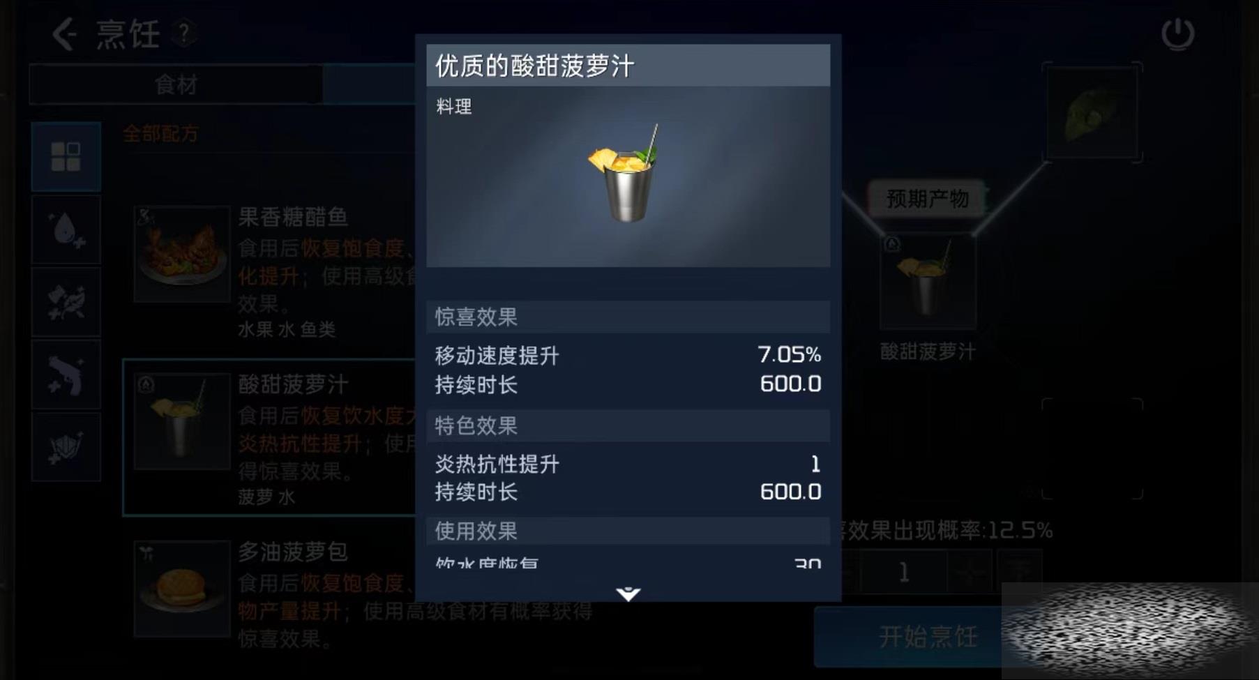 得到酸甜菠萝汁除了增加大量饮水度恢复以及少量饱食度恢复之外,还能提高一点炎热抗性,这在大沙漠中冒险是非常有效的。另外惊喜效果为提升移动速度,这样就可以更方便进行跑路,所以该烹饪使用范围就很广泛。就是用于炎热区域进行探险或收集资源,除了携带其他生存装备以外,提前喝下一杯酸甜菠萝汁,也是能起到很好的效果。
