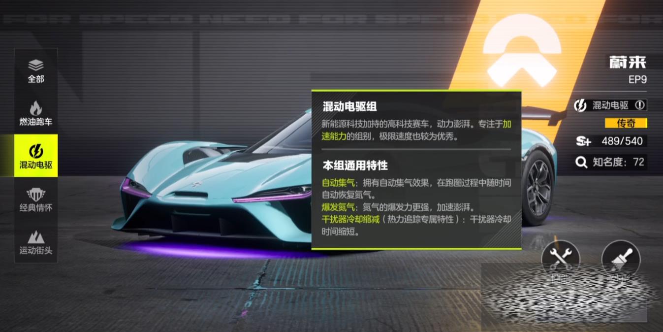 首先第一个给大家介绍的就是混动电驱组赛车,这个组别的代表车型是红旗S9超跑,这个组别的特点是拥有更强的加速能力,在游戏中它们可以自动集气,即随着时间的推移会自动回复氮气,同时这个组的车辆使用氮气的效果会比其他组更好一些,拥有更猛的动力,在热力追踪模式里混动电驱组的干扰器冷却时间更短,可以更频繁地骚扰对手,在需要多段加速的地图里该组别会有更好的表现。