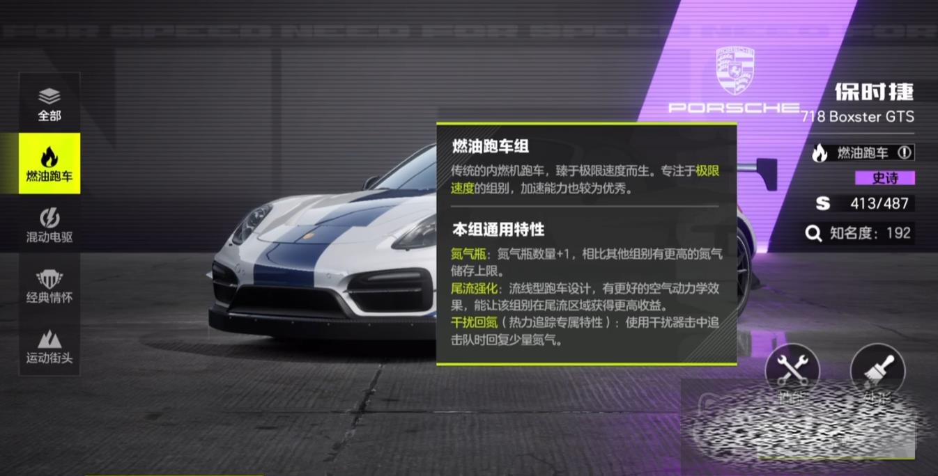 接下来介绍的是燃油跑车组,这一组的代表领跑车是玛莎拉蒂MC20和兰博基尼小牛,这个组的车很多都是后驱车,动力更加强劲,拐弯也更迅速,和电驱组相比该组的极限速度更出众,在比赛中会比其它组赛车多一次氮气存储,并且这个组的车在吃尾流以后获得的速度更快,还能回复很多氮气,拥有极强的后追能力,在热力追踪模式里如果用干扰器击中了对手会回复氮气,在可以油门全开的地图中这一组别的表现会更加优异。