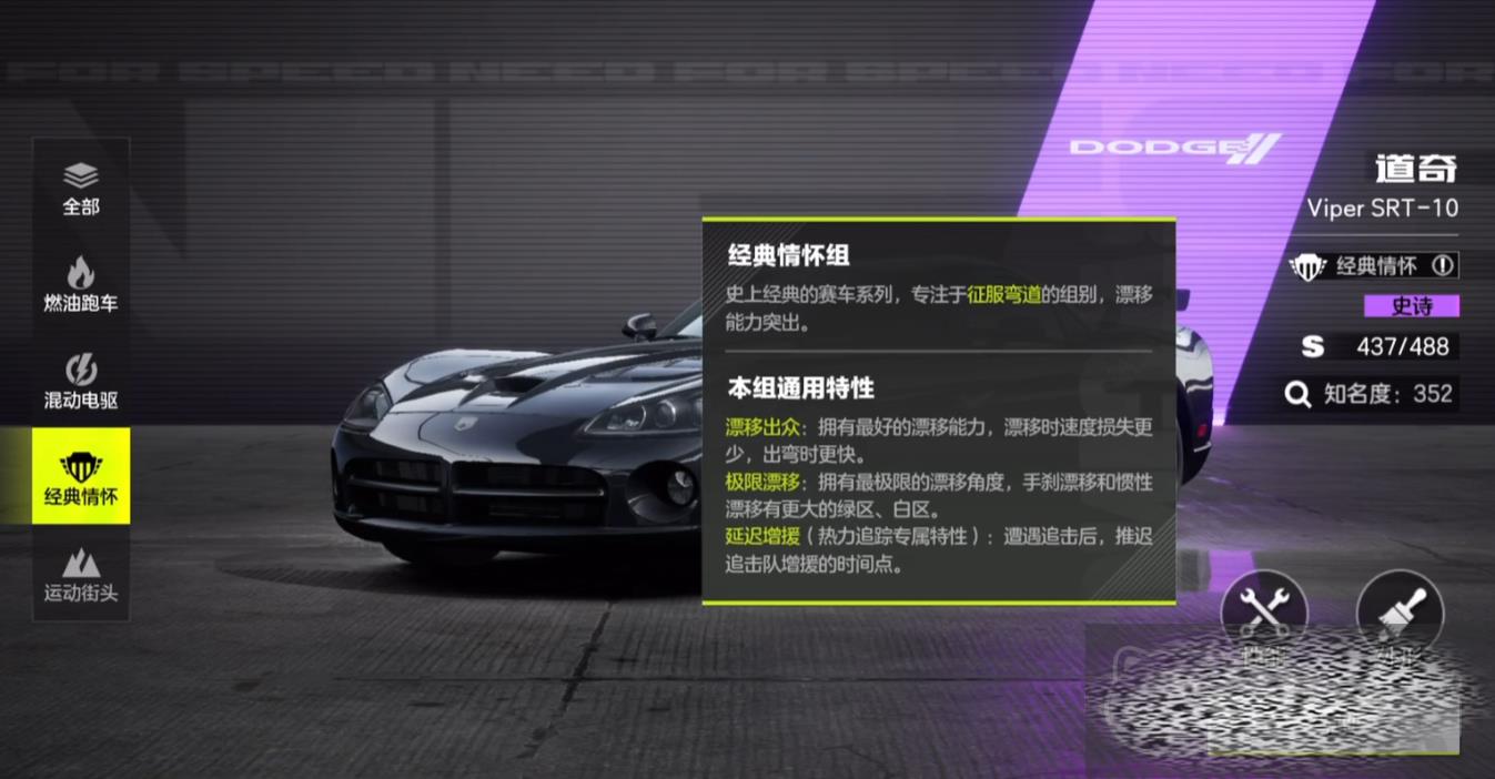 最后给大家介绍的是运动街头组,代表车辆是谢尔比,其他组都是针对性比较强,运动组则是更中庸更全面,拥有全地图适用的特性,并且漂移的稳定性更好,而在面对拥有越野路段的地图时它的作用会发挥的更加明显,其它组跑越野地形会降低10码的车速,但是街头组不会,也是其一大优势。