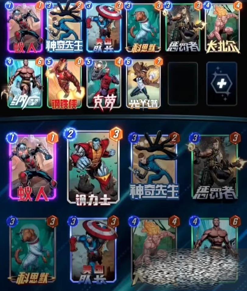 首先介绍一下这一套玩法的核心卡牌,分别是钢铁侠、美国队长、克劳、光谱和纳摩。这套卡组曲线较为平滑,基本可以按照费来拍,有什么就去拍什么,可以通过钢力士、神奇先生和克劳,去拿下一些阴间地形。当然大家在打出克劳和纳摩的卡牌之前,尽量应该规划好要赢得哪两个区域。要在第6个回合,算好点数打出光谱,这样才能赢下比赛。