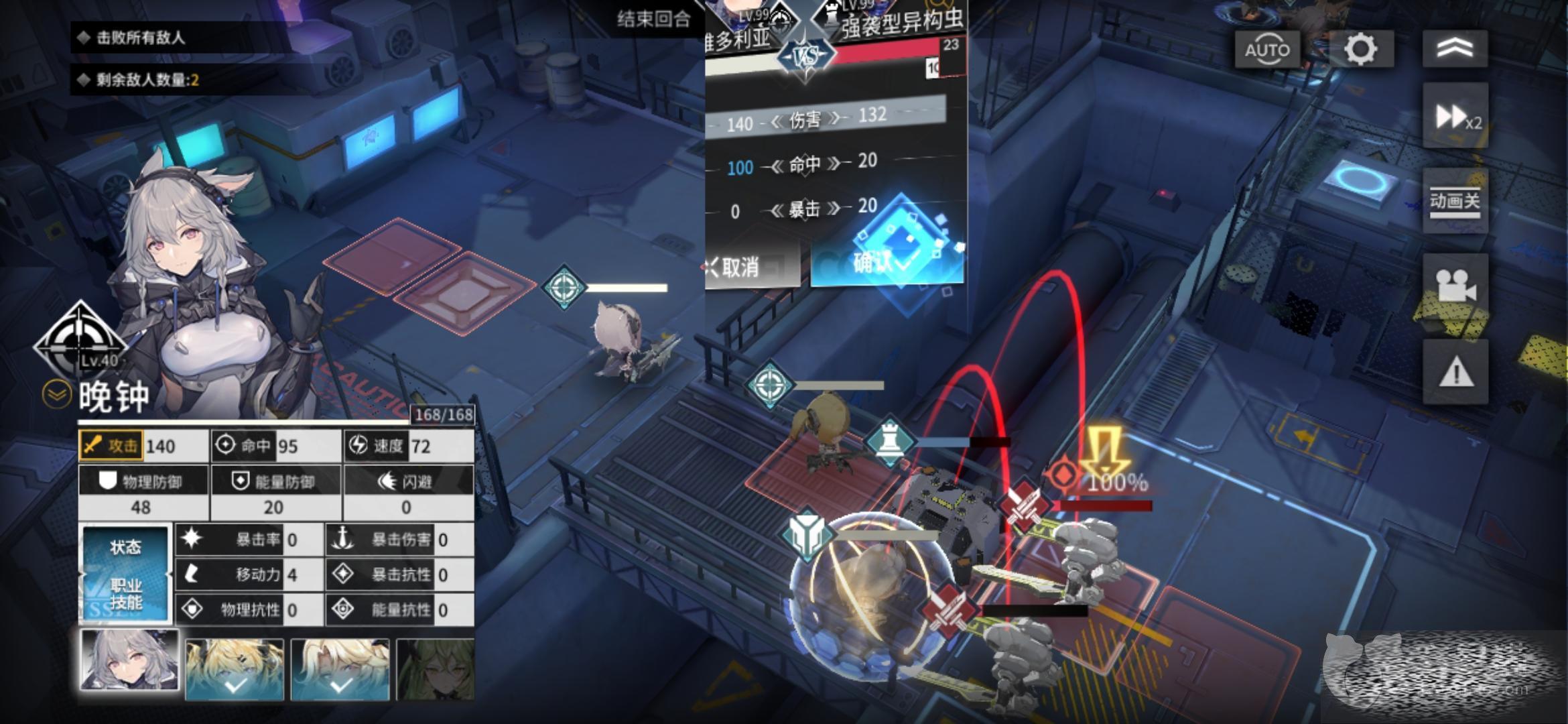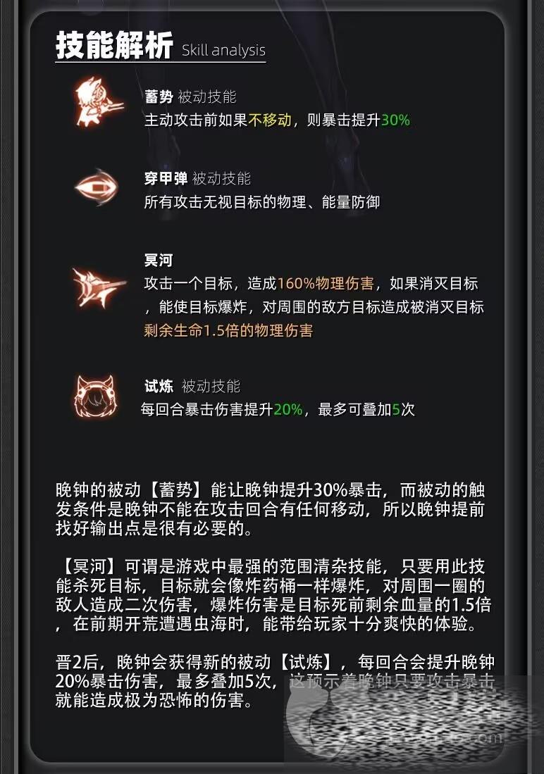 晚钟拥有强大的技能,其中包括被动技能「试炼」,每回合可以叠加爆伤效果,最多叠加5次,每次增加20%的爆伤。一技能「蓄势」在她没有移动时,能提升30%的攻击暴击率。二技能「冥河」使她对单个敌人造成伤害,如果该敌人被击倒,将引发爆炸并对周围敌人造成溅射伤害。最后,她的三技能「穿甲弹」让她的所有攻击都无视敌人的双防,也就是说她的普通攻击造成真实伤害。