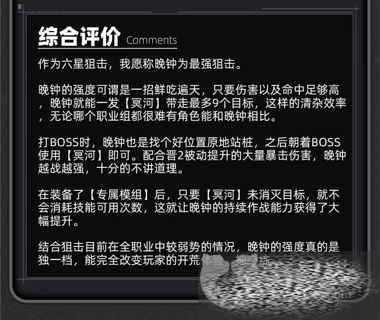 通过小编的介绍,想必大家对晚钟的强度以及玩法有了更精准的认识。对于喜欢玩狙击角色的用户来说,晚钟是一定要体验的,她的强大输出能力令人无法忽视。如果你对晚钟角色感兴趣,不妨在游戏中亲自体验她的威力,相信她将带给你惊喜和满足的战斗体验。