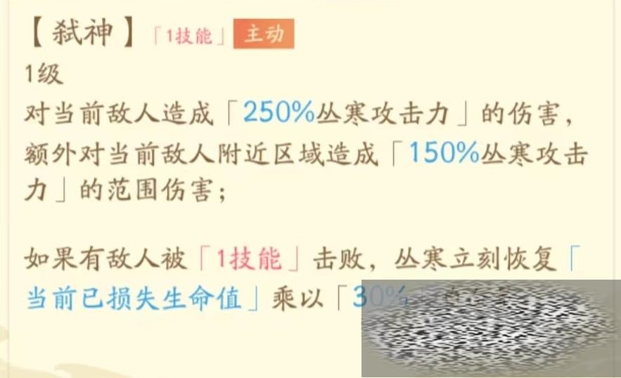 丛寒在游戏中的定位就是爆发输出,这和其他辅助型主角有着本质上区别,自身职业为平衡战士,属性为耐力型。绝技弑神,对当前选中目标造成一次高额伤害,并且额外将部分伤害扩展到当前角色所在附近区域,当然输出方面会有一些衰减。如果敌人被此技能击败,则丛寒可以立即恢复大量生命值。这是一个典型单体点杀技能,如果能由队友将对方血量压下去,丛寒在后面收割,就能始终保证稳定血量。