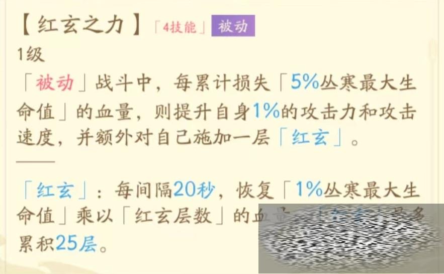 最后一个被动效果红玄之力,在战斗过程中每损失5%最大生命值血量就可以额外提升自身1%攻击力和攻击速度,同时自己获得一层红玄状态。在此状态下每隔20秒就能恢复一次生命值,和层数以及该角色最大血量相关,最多能累积到25层。