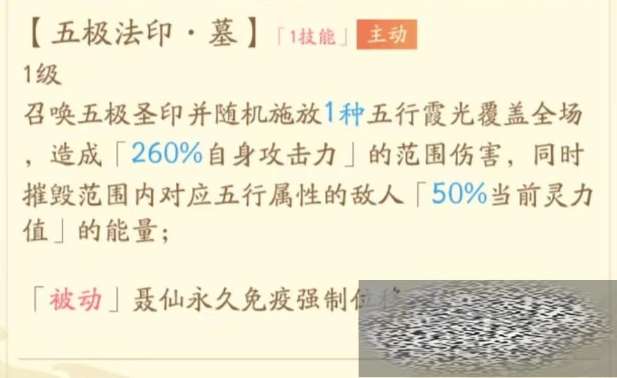 对战过程中定位为控制专精,属于智力型辅助法师。绝技五极法印墓,召唤出五极圣印,并随机释放出一种五行光覆盖全场,除了造成范围伤害之外,还可以摧毁范围内对应五行属性敌人当前50%能量值。另外还有被动效果使得聂仙永久免疫强制位移,也就是不会被击退等所影响。通过提升技能等级摧毁灵力值最多能达到75%,这对敌方限制来说是很可观的,而且随机选择一种五行,让对方无法提前规避。