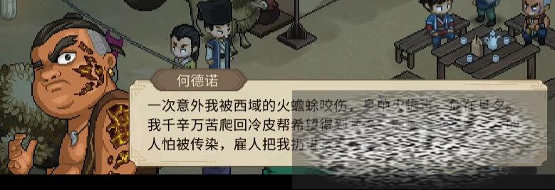 在冷皮帮内,会遇到一个面目狰狞的汉子,他就是冷皮帮的四当家。与他聊天得知他中了火蟾之毒,并且答应当他无法忍受时,可以随时帮他解毒。在之后两人会从认识而熟悉,主角需要在冷皮帮解锁各个角色的剧情;起初是凤璇玑,然后就是四当家何德诺。都是要在夜间聊天,与何德诺更是要在酒馆中相遇,随后从他口中得知中毒的缘由。