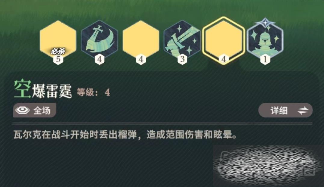 瓦尔克具有的专精是在战斗中可以提升自身暴击增幅,达到三级时增加50点,是非常可观的伤害力专精。全场技能空爆雷霆,战斗开始时直接朝三名敌人丢出榴弹,然后掏出手枪来引爆,榴弹被引爆的时候,一格扇形区域内的敌人都将被眩晕,降低护甲并承受更多伤害,如果多枚榴弹命中同一目标只生效一次。