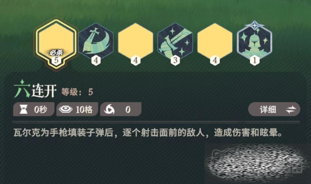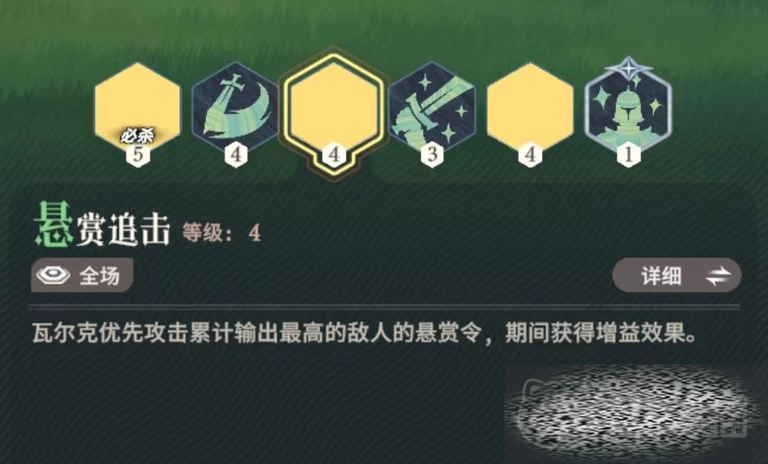 第3个技能悬赏追击,在战斗开始时第10秒钟生效,瓦尔克会计算当前输出最高的敌人发布悬赏令,接取悬赏令后瓦尔克受到的伤害下降,优先攻击被悬赏的敌人,对其造成的伤害提升。当被悬赏的敌人被击败时,瓦尔克将提升暴击,最多能提升15点。该技能满级时领取悬赏令后,可直接使用手枪对其连开三枪,被悬赏的敌人击败后,瓦尔克可以再次领取悬赏令。