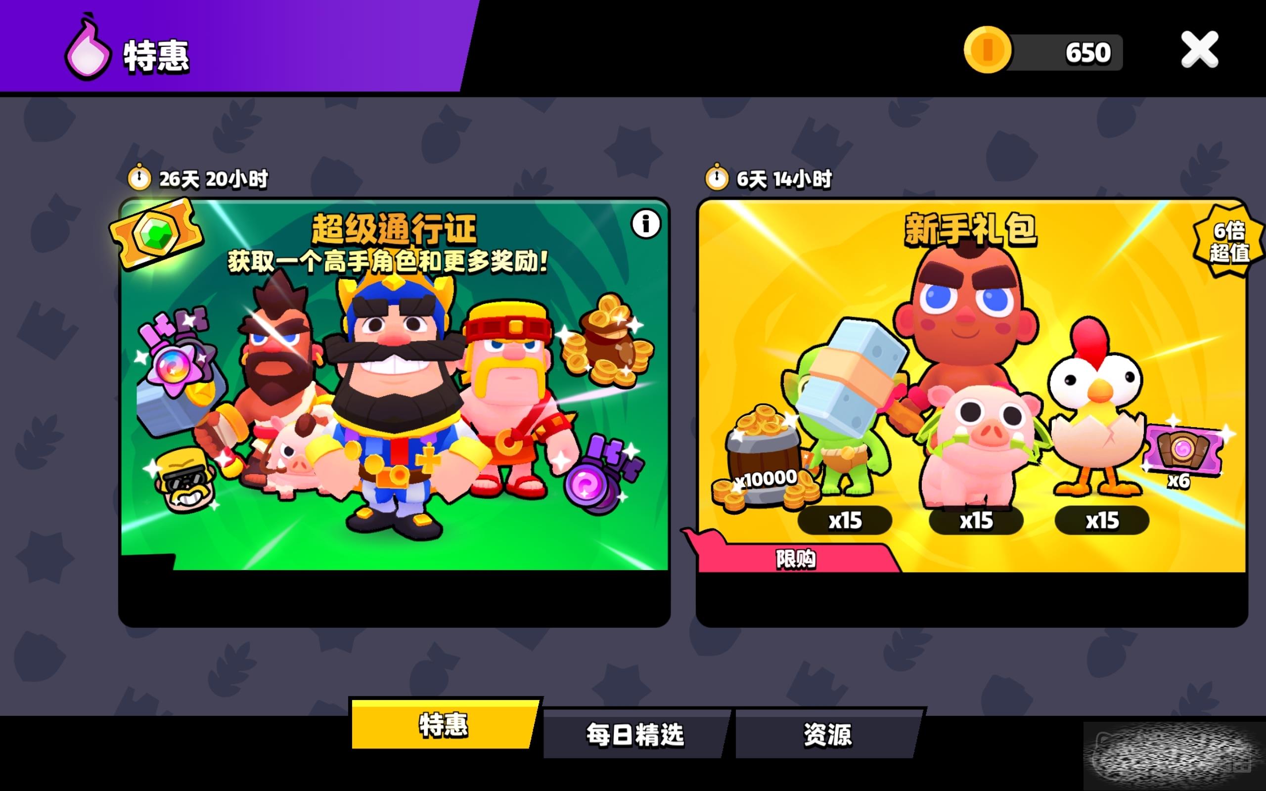 如果你是刚刚开始玩,那么可以买一个新手礼包,其中包含了宝箱券、金币以及角色,有了这些物品可以帮你完成初期的发育。经过一段时间的体验,要是你感觉这个作品还不错,那么还可以在特惠这个地方,开通一个超级通行证,完成固定的目标之后,你就能得到很多专属道具和高级角色。此外,厂商还会安排许多低折扣的资源,让你用低价得到想要的资源。