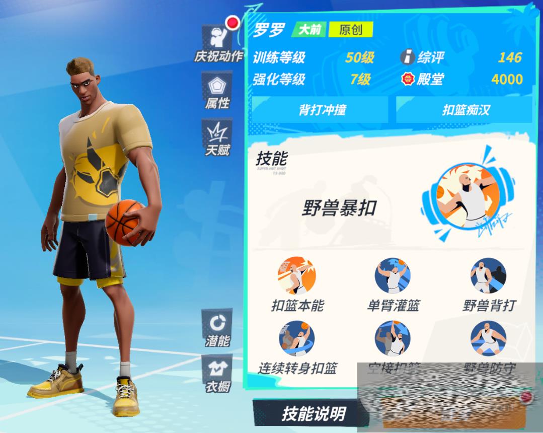 球员姓名是罗罗,在球队当中所处的位置是大前锋,比较擅长的就是背打冲撞,是一名不折不扣的扣篮痴汉。比较适合喜欢在内线进行对抗,或者是喜欢玩扣篮进行得分的球迷来使用这个球员。