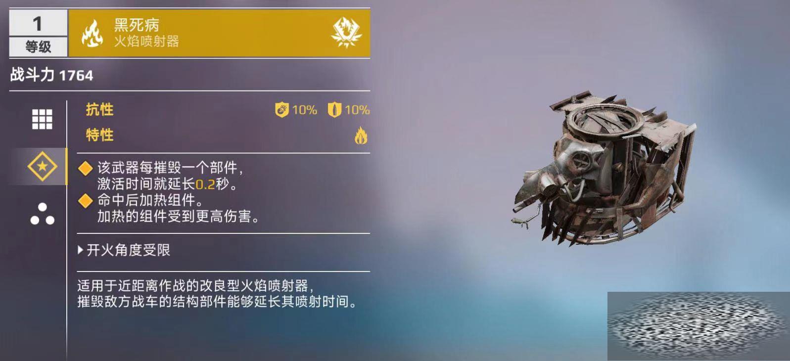 大家在游戏中最初接触到的火焰喷射器并不是黑死病,而是烈焰药剂,黑死病可以理解为烈焰药剂的精简改良版本。大家在前面已经学习了烈焰药剂如何去使用,黑死病的操作方法也保持着高度一致性。有所不同的是,黑死病的特点为该武器每摧毁一个部件,激活时间就延长0.2秒,在命中后能加热组件,被加热的组件将受到更高的伤害。简单来说,这就是用于近战距离作战的改良型火箭喷射器,它可以摧毁敌方战车的结构部件,延长喷射时间。
