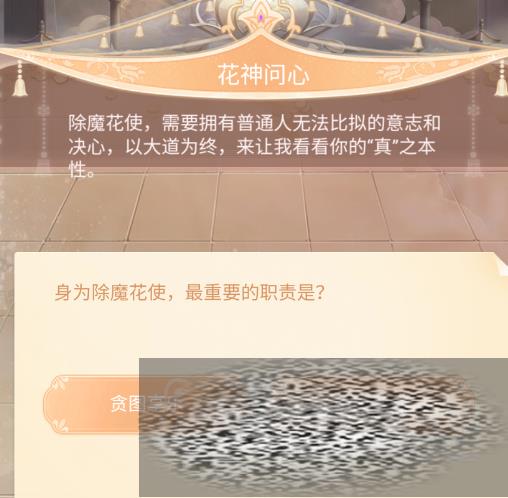 2,击杀林玉茹之后,玩家们会通过剧情的指导,前往试炼,玩家们需要在这一关完成一个题目【花神问心】,给出了四个选项,玩家们选择C选项【除魔卫道】就可以完成试炼晋级了。完成后需要把在路上遇到的【柳青青】给击杀掉,刚刚晋升这个角色打不过我们,随便打就行!