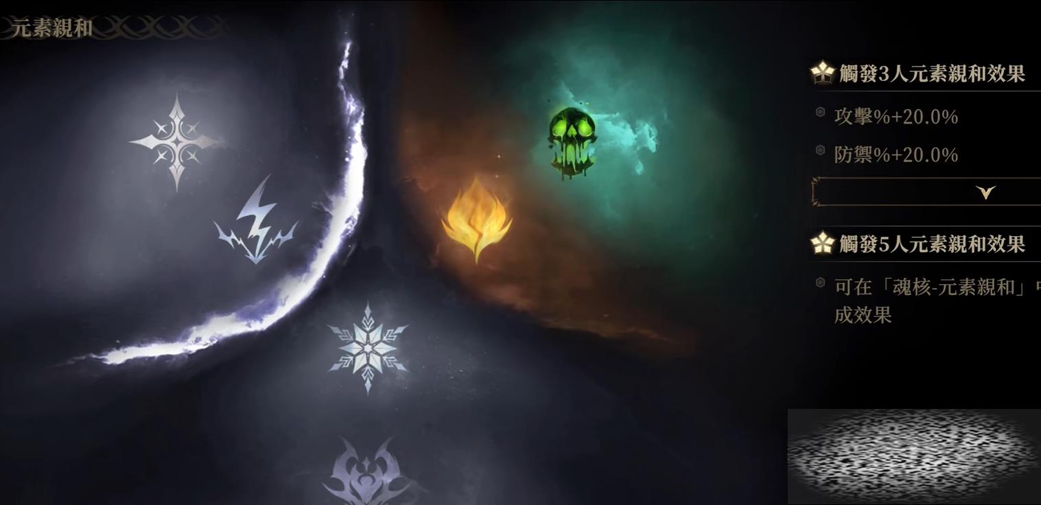 先祖守护在游戏中代表着玩家英雄的初始属性值,当先祖守护的初始属性值达成了元素亲和条件时,玩家的基础战斗力就会得到提升,游戏中能够产生元素亲和的属性分别有三组,它们分别是光属性和雷电属性,冰属性和暗属性,火属性和毒属性,一旦三组元素亲和一同被触发,玩家的阵容可以获得基础攻击倍率增加20%的增幅,并且在防御数值上也有所增加,如果队列之中触发了五组元素亲和,阵容中所有的英雄其属性攻击数值都能够增加10%,实际上在战斗之中玩家凑齐三组元素亲和即可达到战斗收益最大化。