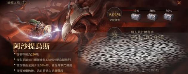 在这一个关卡中,首领的等级已经达到250级,每一个英雄一天内都有一次机会去挑战。一开始难度并不是很大,可如果首领的血量减少到5096时,就会提升整个战斗的难度。