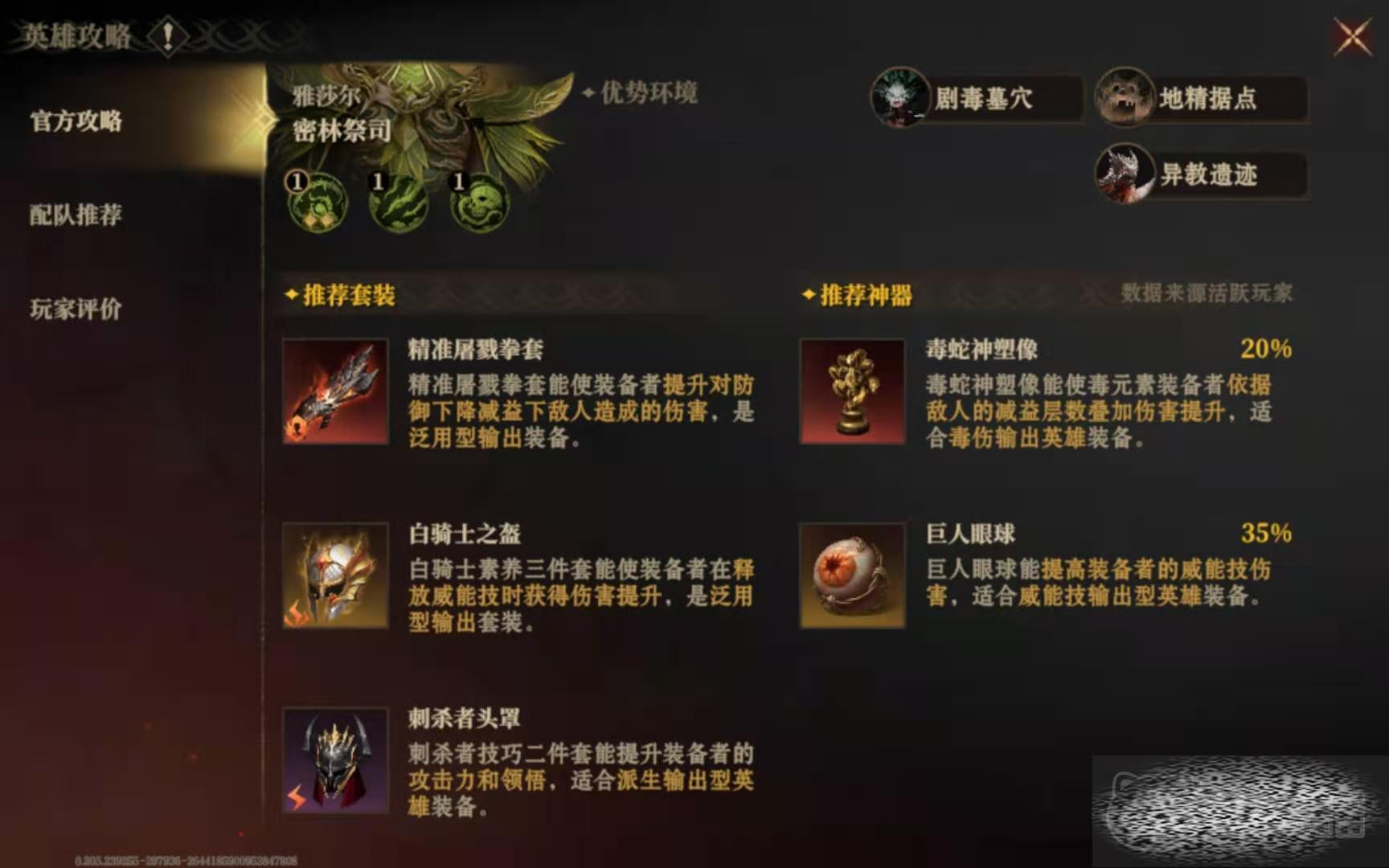 雅莎尔的特点很适合去充当团队的主力输出,不过也要看实际情况,如果对面的英雄克制它,那么就要及时调整自己的策略了,在组队的时候,要优先为其搭配毒系的英雄,这样可以达成更高的元素亲和效果,比如副输出可以选丹契或柯林,坦克用阿尔廷或者弗尔巴斯。