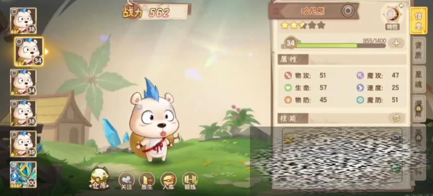 既然费尔斯有自己加状态的技能可以消除给它带来的减防效果,那么一般的减防打法就不适合用来打它;但是我们可以换一个思路,不能减防但是可以给自己加攻击伤害,效果也是差不多的。所以这次战斗不需要小地鼠和小蜗牛这些,而是用上了哈利熊;主要是看中了他的两个技能以及保存自己的buff效果继承给下一位成员的特点,通过技能守住站住,然后释放仪式为自己添加各项攻防属性等级的提升。