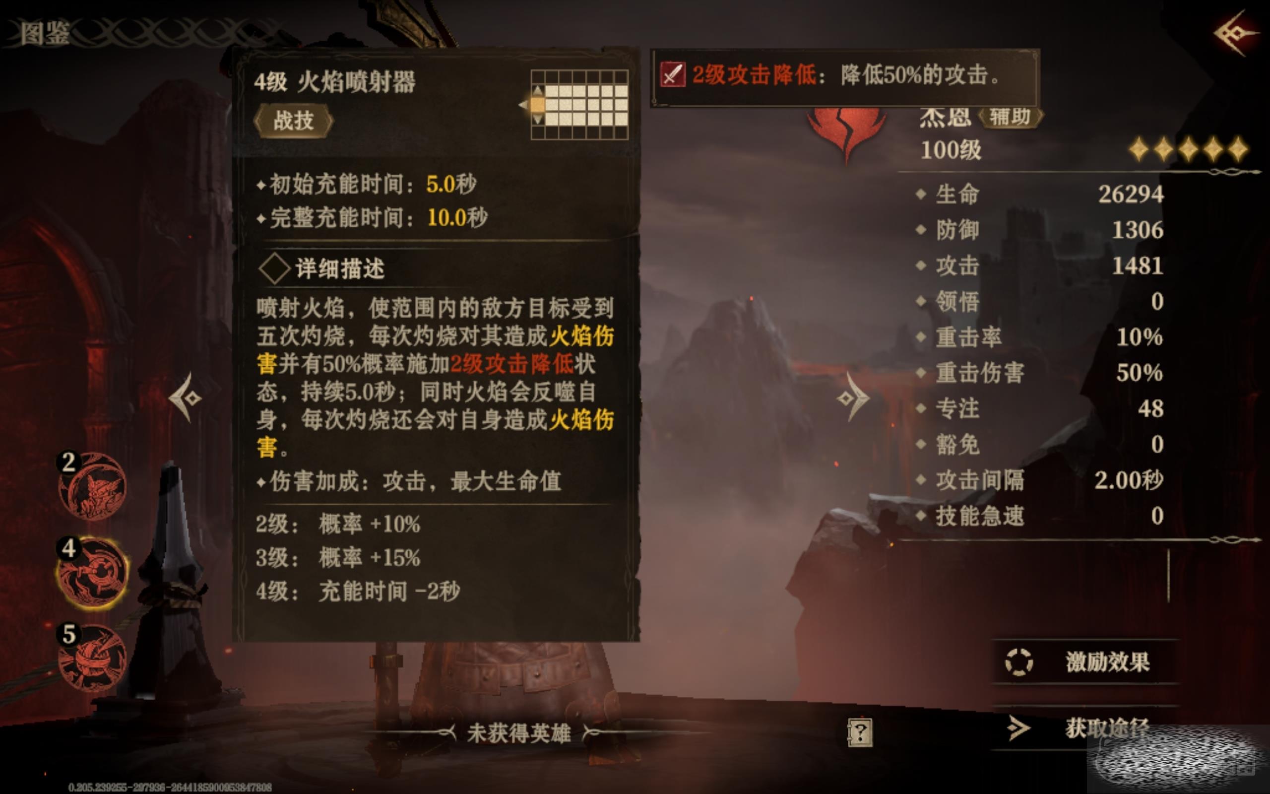 四级的时候就会得到火焰喷射器这个战技,这个 技能可以说是伤敌一千自损八百,释放这个技能后,目标敌人会受到五次重复的灼伤,每次进攻还有机会降低敌人的攻击力,不过这招生效期间,你自身的生命值也会降低。