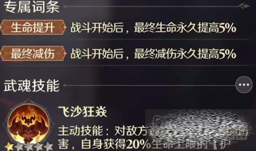 他的专属技能就是飞沙狂焱,也就是一个主动性的技能,在释放之后对敌方造成了220%的伤害,自身也获得了20%以上的生命防护盾。能够使全体格挡提高到5%,持续的时间是两个回合,这个技能真是在武魂增生的状态下得到更好的释放。