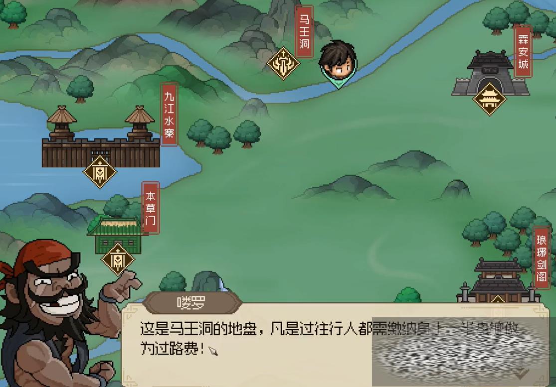 之后我们找到马王洞之后,玩家在靠近洞口时会触发一次战斗。第一次接触时,可能会遇到山贼喽啰的袭击,他们会要求你交出一半的钱财。如果你选择战斗并取得胜利,除了能获得500钱币和心情+10的奖励外,还会继续推进剧情。当然,如果你选择妥协,这群山贼也不会纠缠太久,但接下来你在大地图上移动时,可能会随机遭遇到马王洞的敌人。