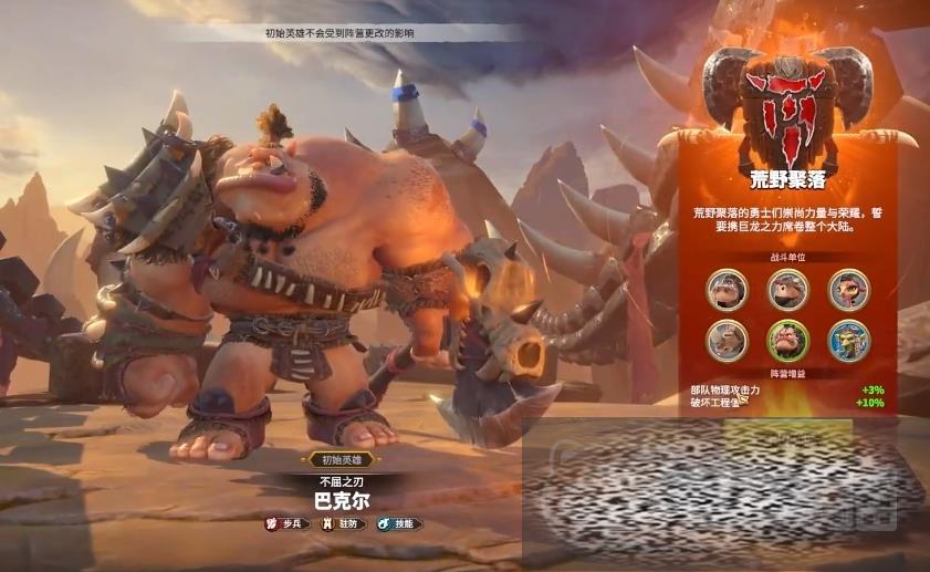 此外巴克尔的被动技能进一步增强了步兵部队的整体攻防能力,这不仅降低了驻防部队受到的技能伤害,还提升了回复效果,使其具备了一定的反击能力,这些特性使得巴克尔成为操作技巧不太熟练的新手玩家的理想选择,同时也解释了为何兽族能成为众多玩家青睐的阵营之一,兽族的选择,不仅因其强大的前线战斗能力和较高的容错率,还因为它能为玩家提供一个游戏起步基础角色。