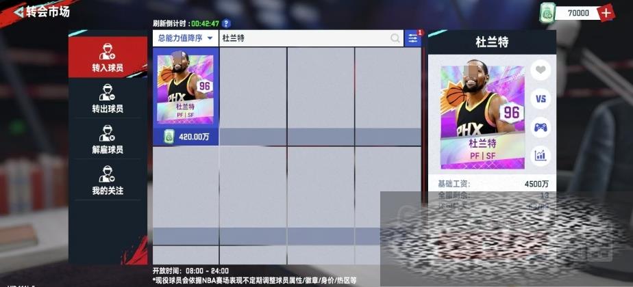 最后为大家推荐杜兰特,他属于一个大前锋,他所拥有的233cm惊人臂展,不仅是他的身体特征,更是他在篮球赛场上攻守兼备的巨大优势,杜兰特的综合评分高达96分,在基础属性方面,他的造犯规能力达到了92分的高分,这一数据充分体现了他在比赛中制造对手犯规、为球队赢得罚球机会的能力,同时他的接球属性也达到了94分,这一属性的高分显示了他在接到球后能够迅速且有效地转化为进攻动作。