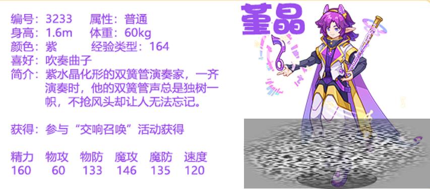 这个宠物属性为普通系,身高1.6m,体重60kg,以其独特的紫水晶化形双簧管演奏家形象吸引玩家。想去拿到董晶,玩家需要参与游戏中的“交响召唤”活动,通过特定条件召唤而来。所以说稀有度以及收集体验都非常不错,收藏爱好者必入,接下来了解一下他的战斗求情况。