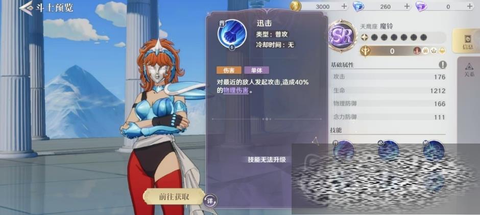 天鹰座魔铃作为游戏中的SR级别角色,有着出色的前排能力和强大的群体伤害技能,她的基础属性攻击176、生命1212、物理防御166和念力防御111,所以一般在爱阵容中她都会成为一个坚固的前排角色,一般是主要承受大量伤害并为后排角色提供保护。