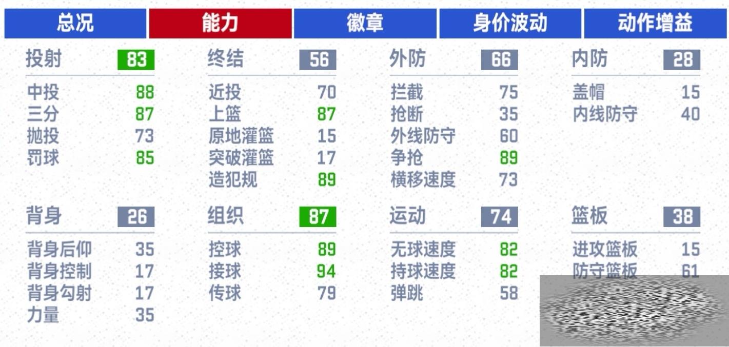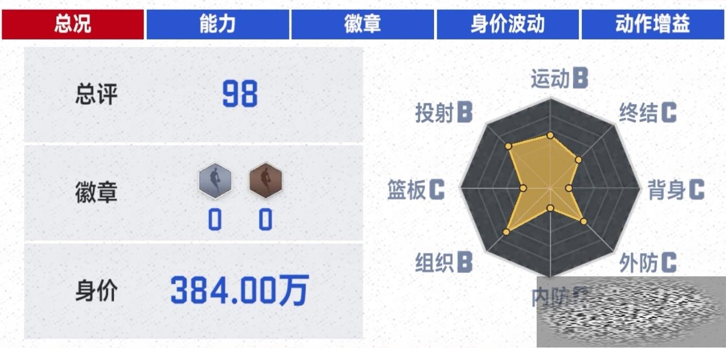 游戏内的所有球员会按照自身的能力被划分成多个级别,系统还会为其设置一个总评分,库里在游戏中拥有98的高分,身价也达到了384万,初始状态下拥有较强的背身组织和投射能力。