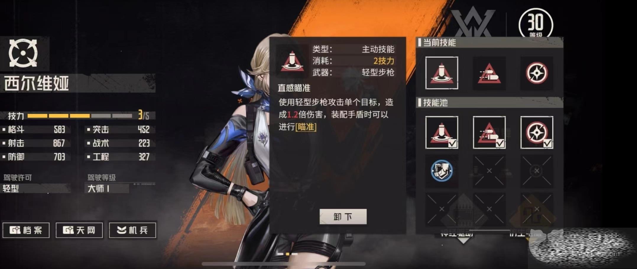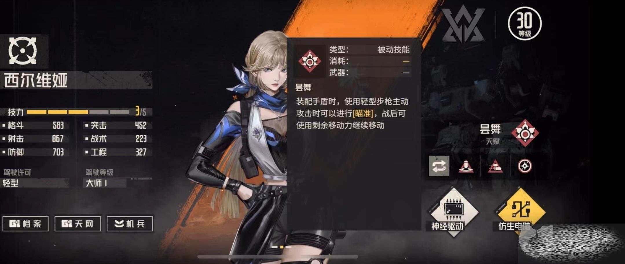 被动昙舞,使装配手盾时轻型步枪主动攻击时能够进行瞄准,战后可以将剩余移动力利用起来,继续移动。肃清,在攻击耐久时低于50%部位时伤害提升。残魂,使得该角色手臂被击破时提高回避率,影形,是在腿部被击破时移动力不会下降,这两个被动在实战中还是很有效果的,可以不用惧怕腿部被打掉以后无法行动。最后猎袭是在发动攻击时距离目标越远,伤害提升越高,最多能提升到20%。