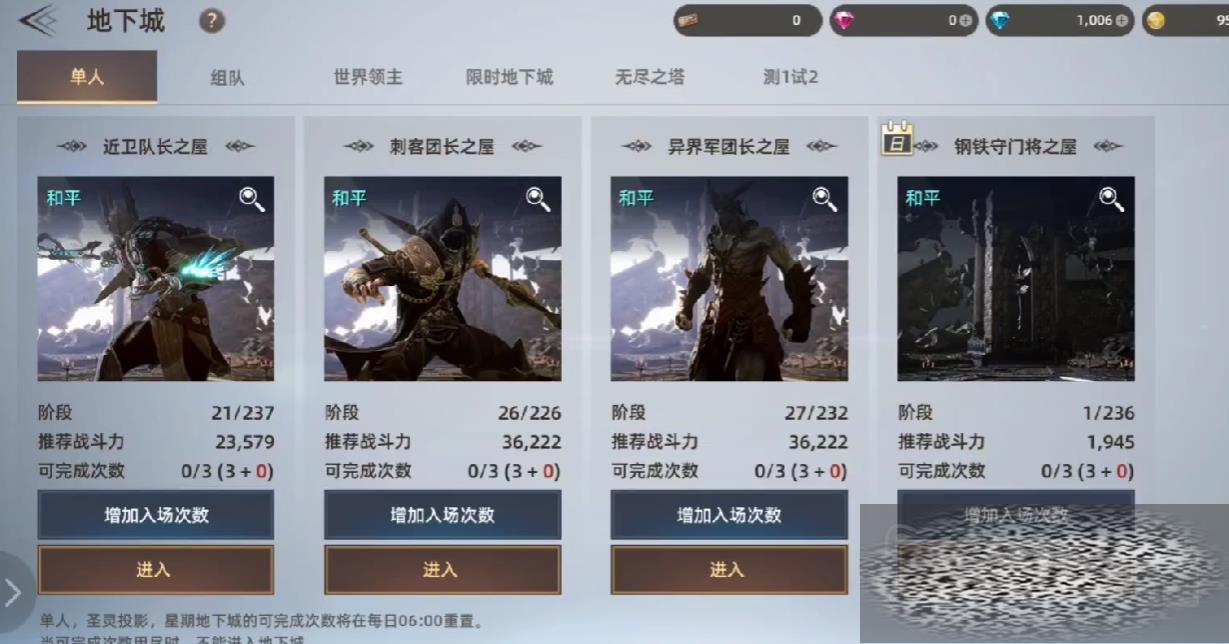玩家可以通过每日挑战单人地下城来获得相关的奖励,单人赛之中有近卫队长、刺客团长、异界军团长、钢铁守门将的观察模式,如果玩家想要获得琳兮这张卡牌,则需要去挑战异界军团长,异界军团长总共有232个阶段,推荐玩家战斗力达到三万六之后再进入,游戏中的每日挑战次数只有三次,玩家可以通过使用特殊道具来增加奖励次数。