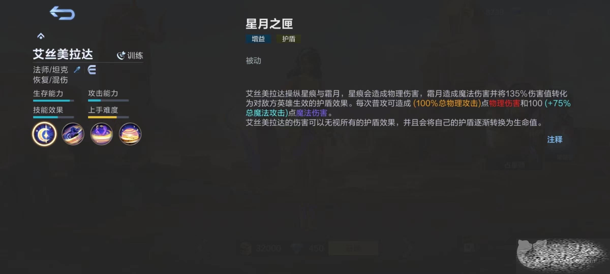 被动技能星月之匣,能操动星痕与霜月两种力量造成伤害,也就意味着普攻可以造成两次输出,并且无视所有护盾效果。不仅仅是普攻,凡是艾丝美拉达造成的伤害都能无视护盾,并且会将自己护盾逐渐转化为生命值。如果看完被动之后感觉比较复杂不知道如何去使用,还需要继续了解主动技能效果。
