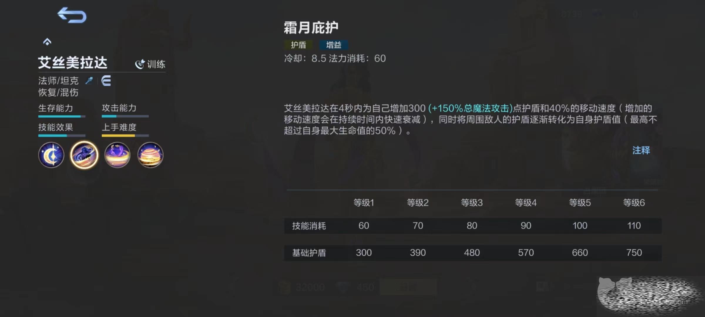 一技能霜月庇护,4秒内为自己增加护盾值和移动速度,增加的移速在持续时间内快速衰减,并且将周围敌的护盾逐渐转化为自身护盾值,最多不超过最大血量的50%。简单来说就是开盾和开加速,同时周围敌人身上如果带有护盾,将会掠夺过来供自己使用。