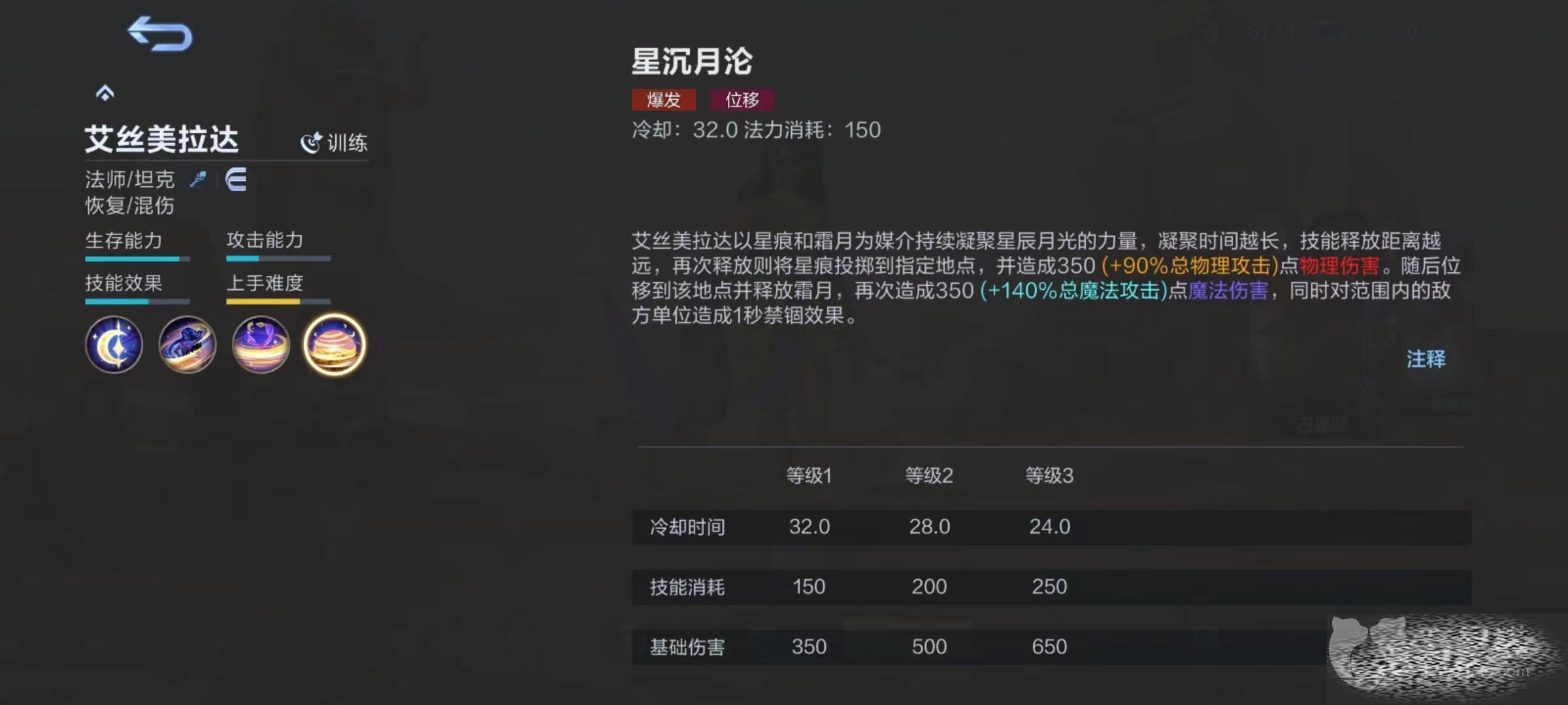 大招星辰月沦,以星痕和霜月为媒介,聚集月光星辰力量,凝聚时间越长释放距离也就越远,再次点击技能就可以将星痕投到指定地点。造成物理伤害后,随后立即为移到该地点再释放霜月,造成一次魔法伤害,范围内所有敌人将会受到禁锢效果。该技能在先手方面非常有优势,一定要根据施法距离确定凝聚时间,最好能恰到好处,这样不耽误节奏。