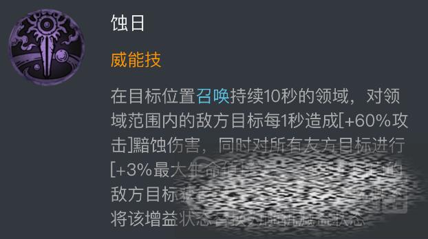 阿斯塔恩的一技能威能技蚀日可以在目标处召唤一个持续十秒的领域,而且可以对领域范围内的敌人造成伤害,同时还可以对所有的友军进行治疗的效果。