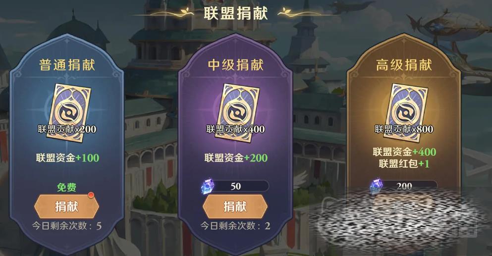 玩家们在到达一定等级之后便可以开启联盟这个玩法,玩家们在开启后可以选择加入联盟或者是自己创立一个联盟。创立联盟则是需要满足一定的条件才可以。玩家们可以根据自身的情况和资源来选择。在加入联盟之后,玩家们可以每日给联盟进行捐献,捐献有三个档位进行选择,玩家们可以选择最适合自己的来进行,在捐献之后便可以获取到联盟的贡献度,这个贡献度在满足条件之后是可以获取到额外的材料和联盟贡献等等。而贡献度则是可以在联盟商店兑换物品。