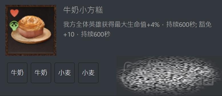 牛奶小方糕:是一道由两份精致小麦和两份牦牛奶制成的甜点,这道小方糕能为我方全体英雄带来生存增益,食用牛奶小方糕后,我方全体英雄将获得最大生命值+4%的提升,持续600秒,这意味着英雄们在战斗中的生命值上限将得到提升,同时,牛奶小方糕还能为英雄们提供豁免+10的效果,持续同样长的时间,所以英雄们在面对负面效果时具有更强的抵抗能力。