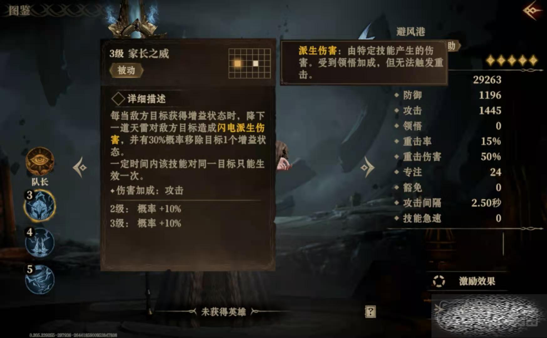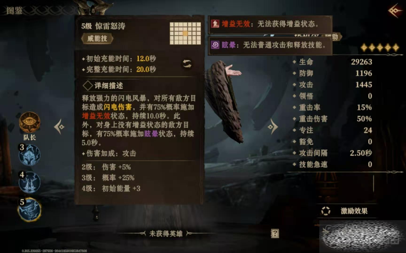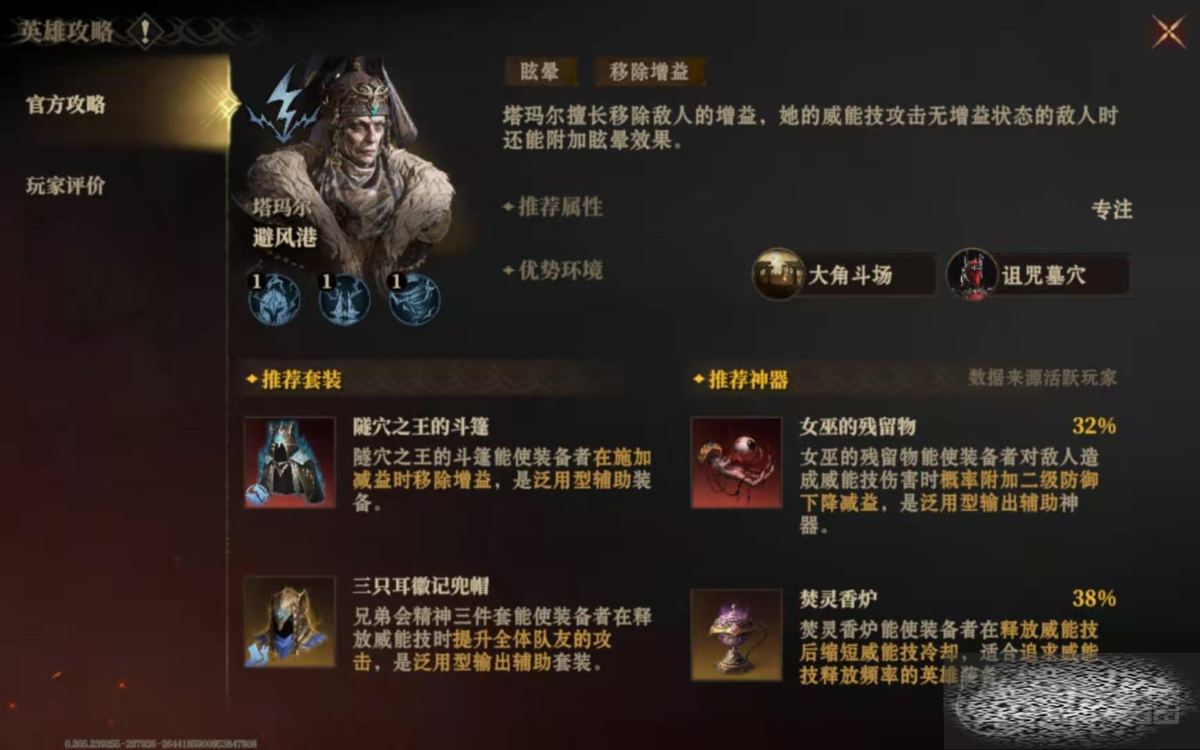 这个英雄比较擅长移除对手身上附带的增益效果,并使敌人陷入到眩晕状态中,便于己方去发动进攻。基于这个特性,后续玩家要着重培养它的专注值,要是资源充足的话,也可以提升一下豁免值。