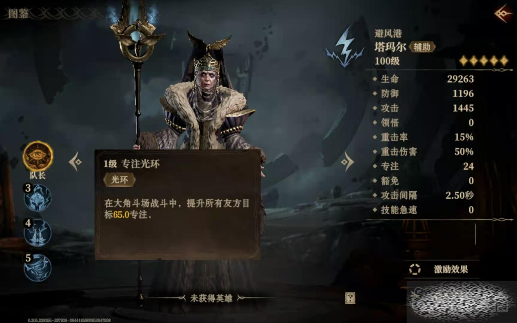 塔玛尔在一级的时候,拥有专注光环的队长技能,可以升高包括自身在内的所有队友的专注值,不过仅限于大角斗场这个场景中。