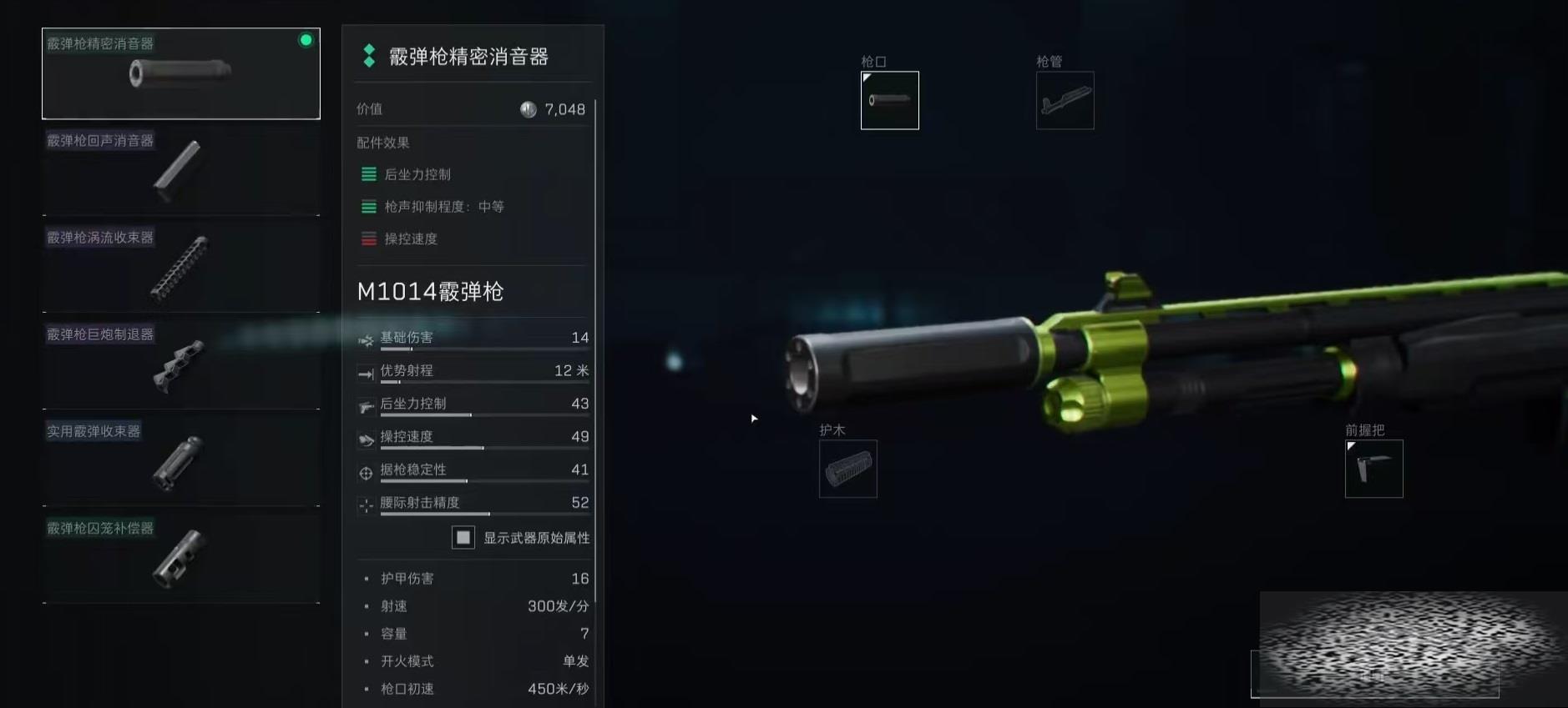 接下来推荐一款属性更强的满改配置介绍,枪管上搭配m1014实用枪管,能增加有效射程和枪口初速,提升腰际射击精度以及扩展弹舱容量等。枪口位置选择霰弹枪回声消音器,它有很高的枪声抑制程度,以及优秀的后坐力控制属性。配合上LA-3C绿色激光雷指,对于操控速度,腰际射击精度都有着更出色的增强。还有m1014导轨护木,提供扩展改装槽位,增加操控速度和后坐力控制。