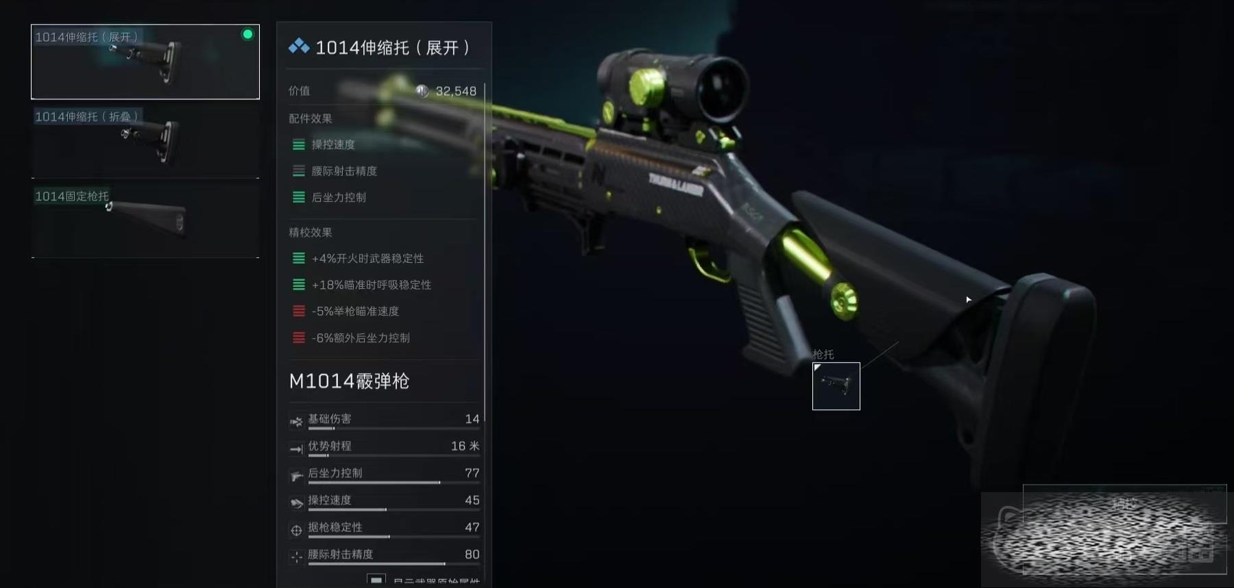 左导轨搭配上竞赛阻手器,这款配件对于操控速度和腰际射击精度都有着加成。枪托位置选择1014伸缩托,大幅改善操控速度和后坐力控制,要注意是伸缩托的展开状态。这一次瞄准就不再是简单的全息或红点,而是推荐侦察1.5/5可调瞄准镜。这样一番改动之后,在外观方面已经和之前有着很大的区别,在战斗过程中的适应性更强。