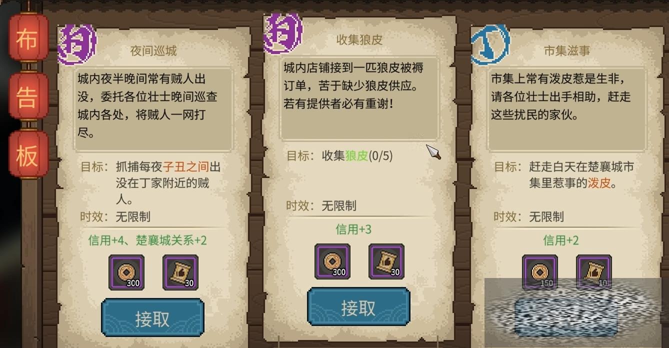 悬赏任务是有着难度等级的,一般分为甲乙丙,级别越高难度越大,所给予的奖励也就越丰富。悬赏任务之中常规的收集或者是杀敌悬赏都是有着时效的,如果玩家们不能在时间内完成,便会降低信用和对应地区的关系。