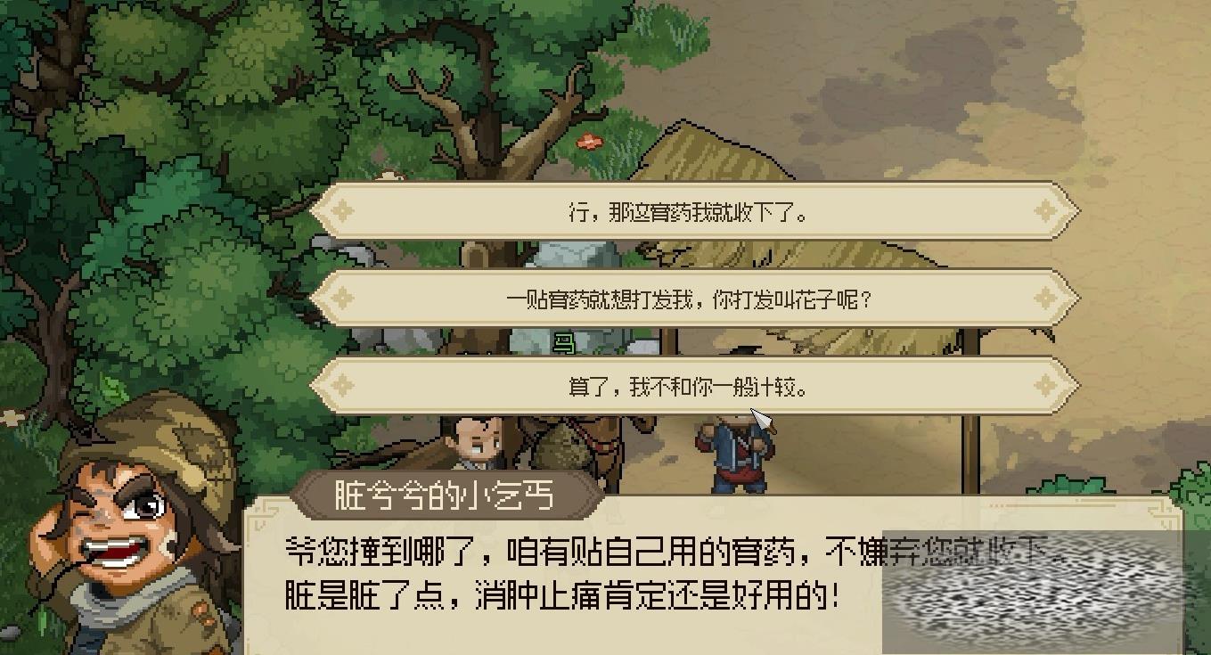 我们在无名小村的时候会在村口撞到一个乞丐,我们在对话中选择行,那这膏药的选项,就会得到配饰狗皮膏药,等到洪小七离开的时候,玩家会发现自己身上的钱袋消失不见了。