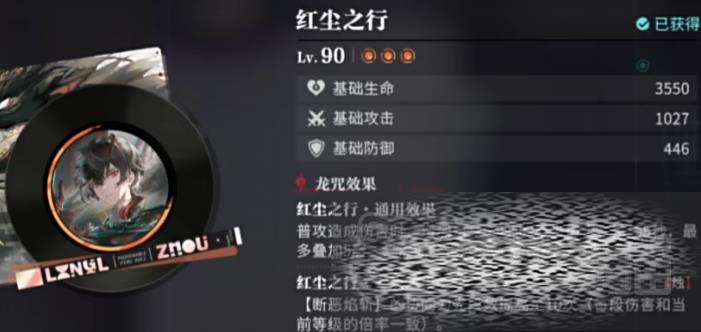该游戏中的装备叫做龙咒,红尘之行则是强大的龙咒。佩戴之后可以获得高额的生命值攻击力及防御值,所以更适合近战角色使用。除此之外还能带来两种特殊效果,第一种就是普通攻击对敌人造成伤害时,可以叠加暴击伤害。成功叠到5层的话,还可以获得高额的咒术伤害加成。