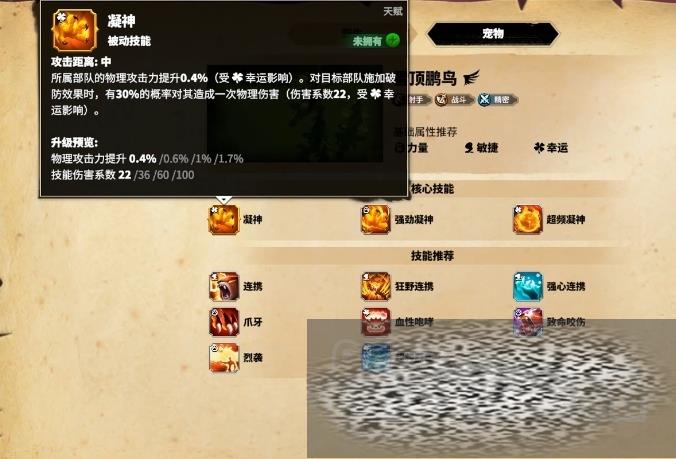 当克莱恩所率领的部队进行普通攻击时,有20%的概率对目标施加破防效果,这种状态将持续3秒,期间目标的防御力降低20%。这种突然的防御削弱可以显著提高我方在此时间段内对其造成的伤害,此外破防效果还能与另一位弓兵英雄尼尔科的觉醒技能相互触发,使得克莱恩和尼尔科能够形成强大的组合,在宠物的选择上,将克莱恩与雪顶鹏鸟搭配使用,可以激活后者的天赋技能凝神,这一技能有概率在攻击时额外触发一次物理伤害,增加了战斗中的伤害输出。