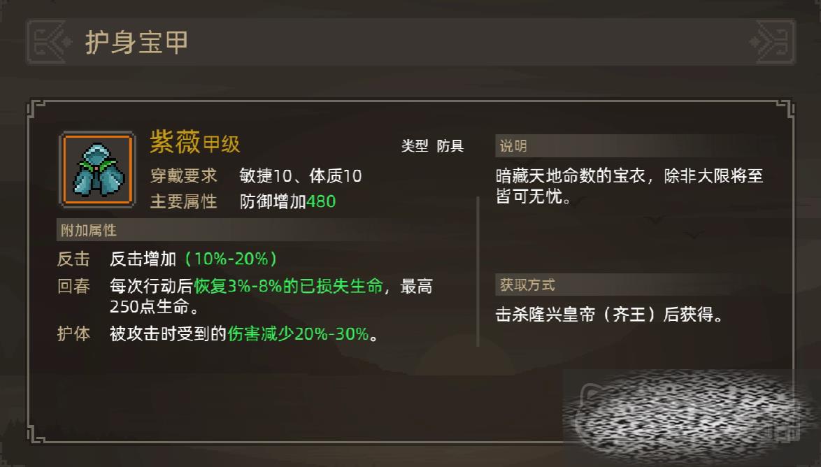 最后还有一些金色防具是要求玩家完成主线任务才能获得的,例如紫薇,他就必须在主线任务当中击杀齐王才能够获得,其反击能力和防御力都是很高的,但是在游戏的中期和后期才能够获得。